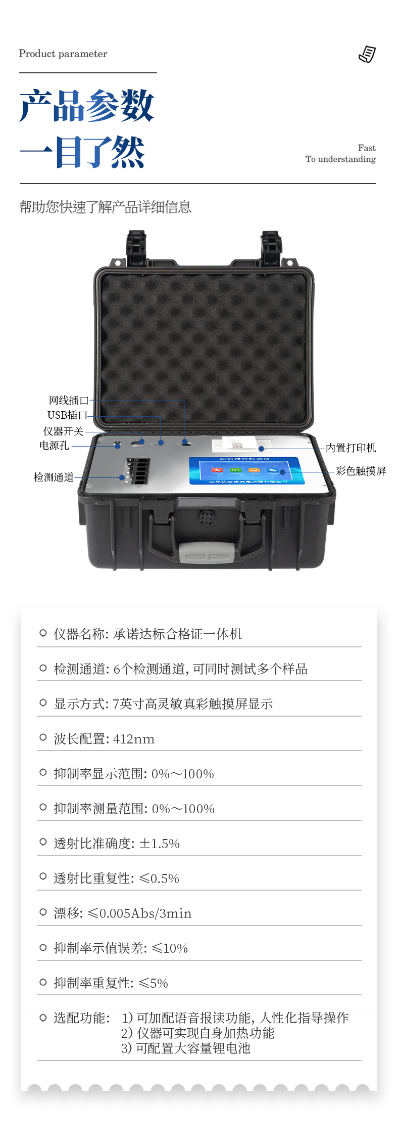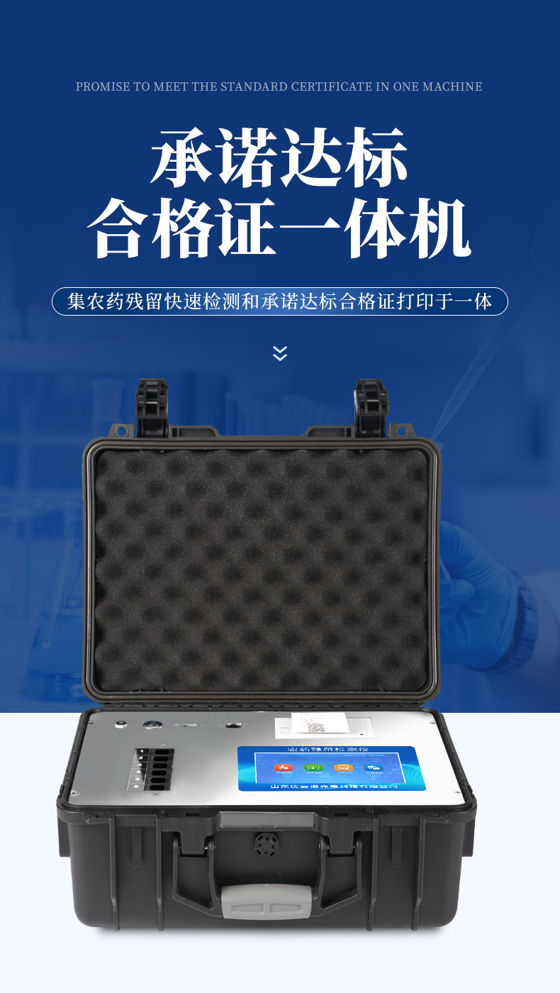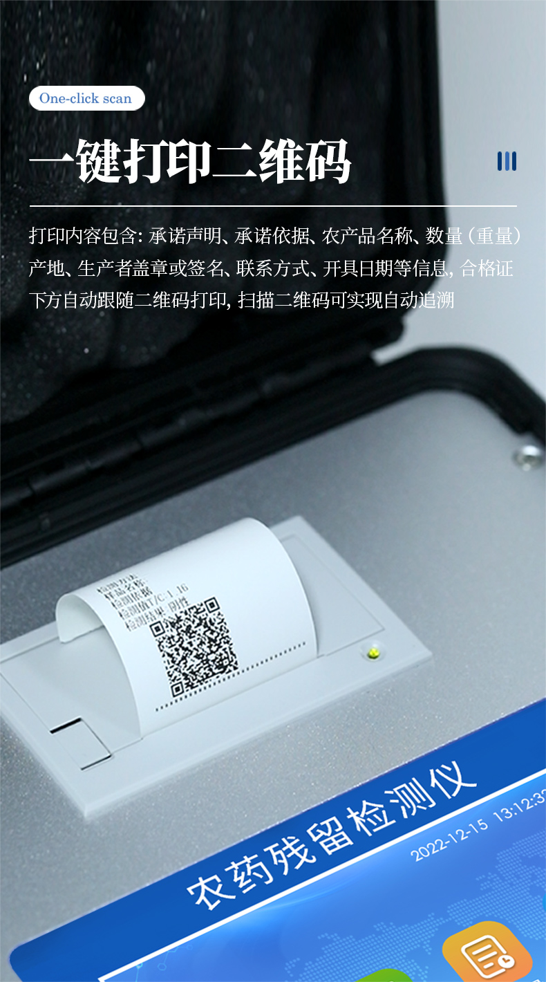 山東優(yōu)云譜光電科技有限公司是一家專業(yè)生產(chǎn)食品快檢儀器的高新技術(shù)領(lǐng)域企業(yè)。我公司根據(jù)農(nóng)村農(nóng)業(yè)部辦公廳關(guān)于《加快推進(jìn)承諾達(dá)標(biāo)合格證制度試行工作的通知》,在原有的食用農(nóng)產(chǎn)品合格證檢測打印一體機(jī)的基礎(chǔ)上優(yōu)化了打印標(biāo)簽,使打印標(biāo)頭和打印內(nèi)容符合承諾達(dá)標(biāo)合格證的最新要求。該儀器集農(nóng)藥殘留快速檢測和承諾達(dá)標(biāo)合格證打印于一體,智能化程度高,在快速檢測的同時實現(xiàn)承諾達(dá)標(biāo)合格證的打印。打印內(nèi)容包含:承諾聲明、承諾依據(jù)、農(nóng)產(chǎn)品名稱、數(shù)量(重量)、產(chǎn)地、生產(chǎn)者蓋章或簽名、聯(lián)系方式、開具日期等信息,合格證下方自動跟隨二維碼打印,掃描二維碼可實現(xiàn)自動追溯。實現(xiàn)農(nóng)產(chǎn)品安全的全程數(shù)據(jù)溯源,適合各地檢測機(jī)構(gòu)、農(nóng)業(yè)合作社、蔬菜批發(fā)市場等單位使用。