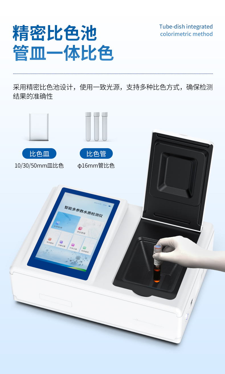 5、支持10mm、30mm、40mm、50mm皿比色和φ16mm管比色等比色方式,多元選擇,確保測(cè)量的準(zhǔn)確性;