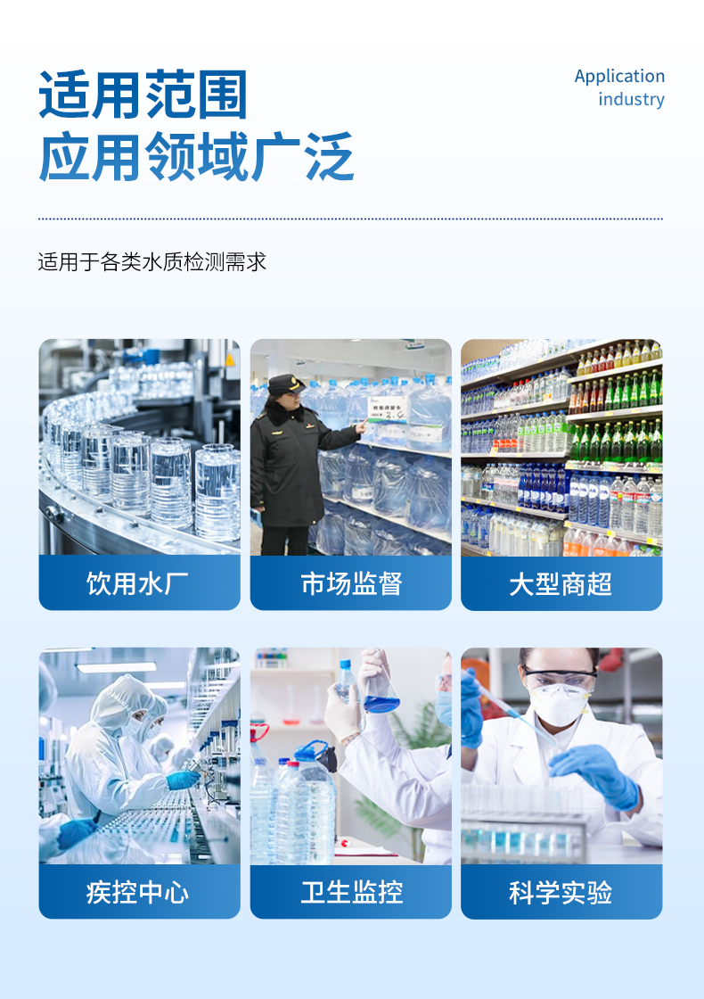能夠廣泛的應(yīng)用于飲用水廠生產(chǎn)檢驗(yàn)、市場(chǎng)監(jiān)督部門質(zhì)量監(jiān)督、大型商超質(zhì)量抽檢、疾病控制中心、衛(wèi)生監(jiān)控等。