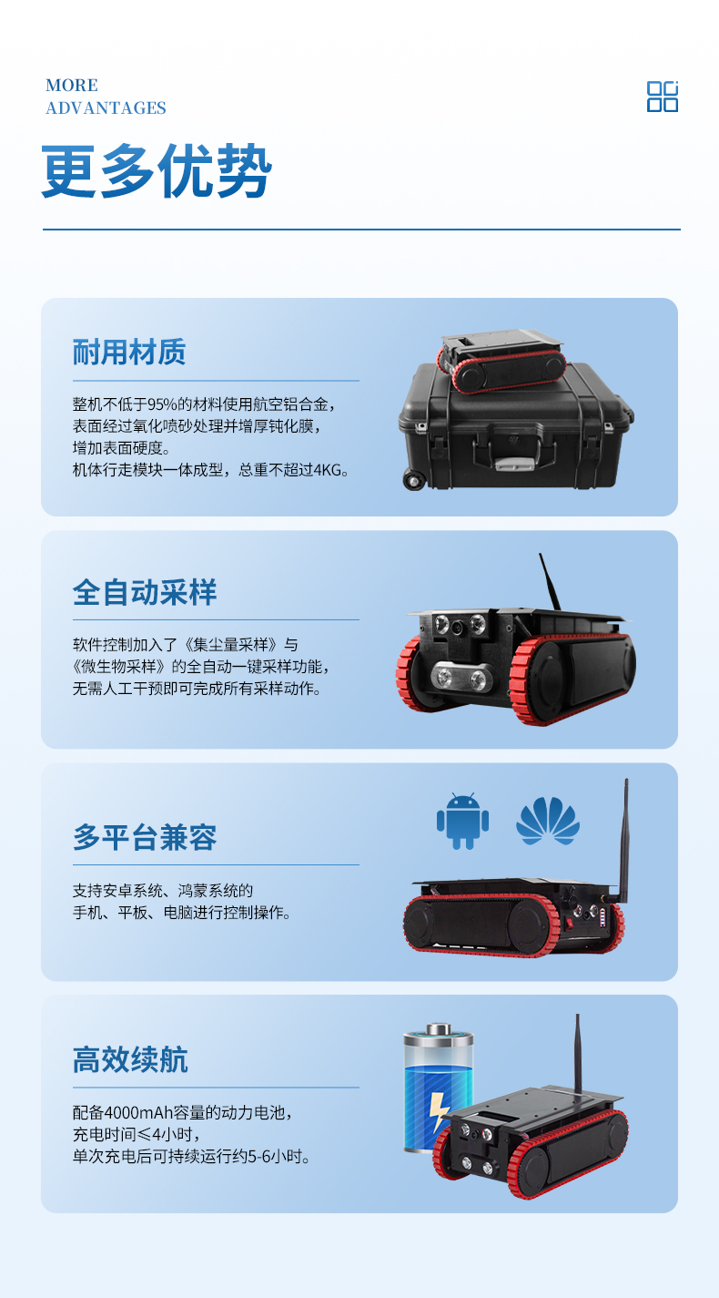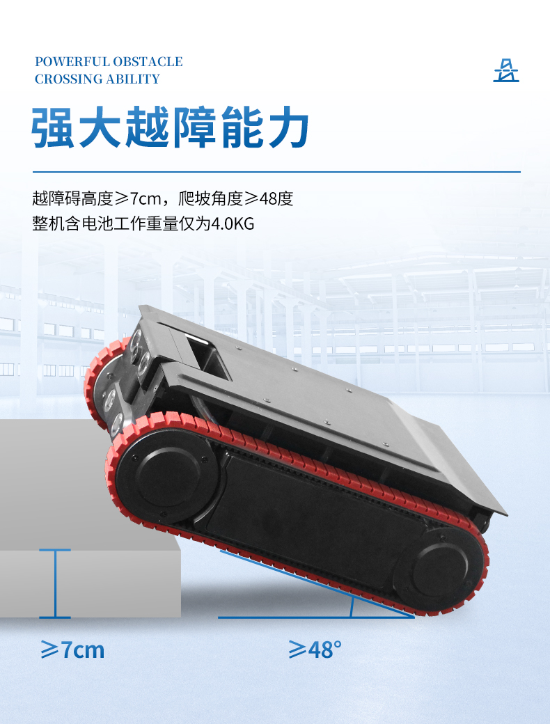強大越障能力:越障礙高度≥7cm,爬坡角度≥48度,整機含電池工作重量僅為4.0KG。