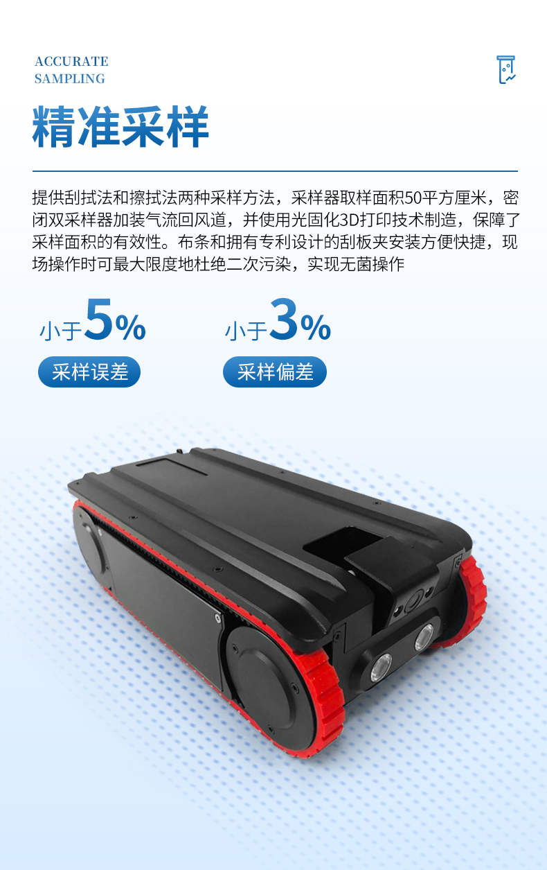 精準采樣:提供刮拭法和擦拭法兩種采樣方法,采樣器取樣面積50平方厘米,密閉雙采樣器加裝氣流回風道,并使用光固化3D打印技術制造,保障了采樣面積的有效性。布條和擁有專利設計的刮板夾安裝方便快捷,現場操作時可最大限度地杜絕二次污染,實現無菌操作。采樣誤差小于5%,采樣偏差小于3%。