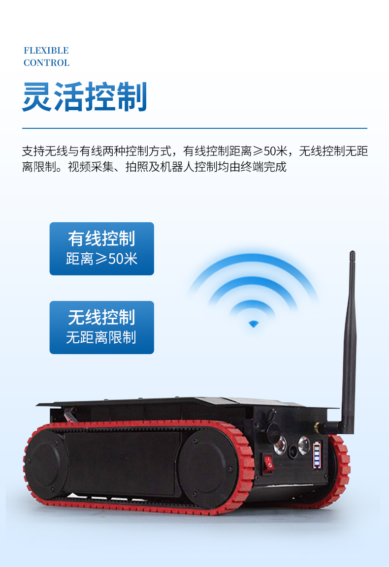 靈活控制:支持無線與有線兩種控制方式,有線控制距離≥50米,無線控制無距離限制。視頻采集、拍照及機器人控制均由終端完成。