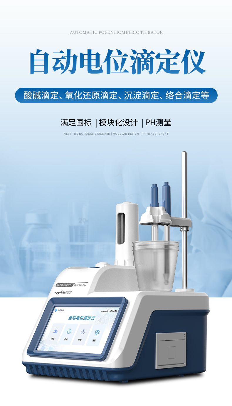自動電位滴定儀是一種用于化學分析的精密儀器,他通過自動添加滴定劑來確定樣品中特定成分的濃度。該儀器基于電位滴定原理工作,即根據在滴定過程中電池電動勢的變化來確定滴定終點的一款滴定設備。設備滿足國家檢定規程JJG 814-2015《自動電位滴定儀》儀器級別中的0.05級別,即儀器最大示值誤差為±1.5%,儀器示值重復性≤0.2%