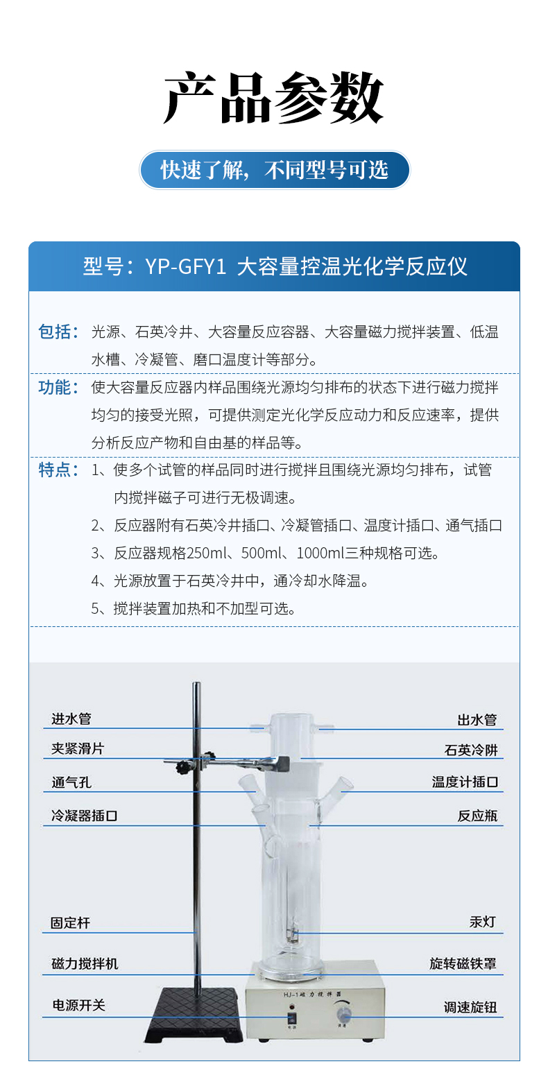 | YP-GFY2 多試管反應器 | 包括:光源、石英冷井、石英試管、濾光裝置、多試管攪拌裝置、低溫水槽等部分。 功能:使試管內樣品圍繞光源均勻排布的狀態下進行磁力攪拌均勻的接受光照,可提供測定光化學反應動力常數、量子產率等 特點:1、使多個試管的樣品同時進行攪拌且圍繞光源均勻排布,試管內攪拌磁子可進行無極調速,可連接氣相色譜儀。 2、光源放置于石英冷井中,通冷卻水降溫。 3、石英試管內放置光照溶液,30ml或50ml可選 |