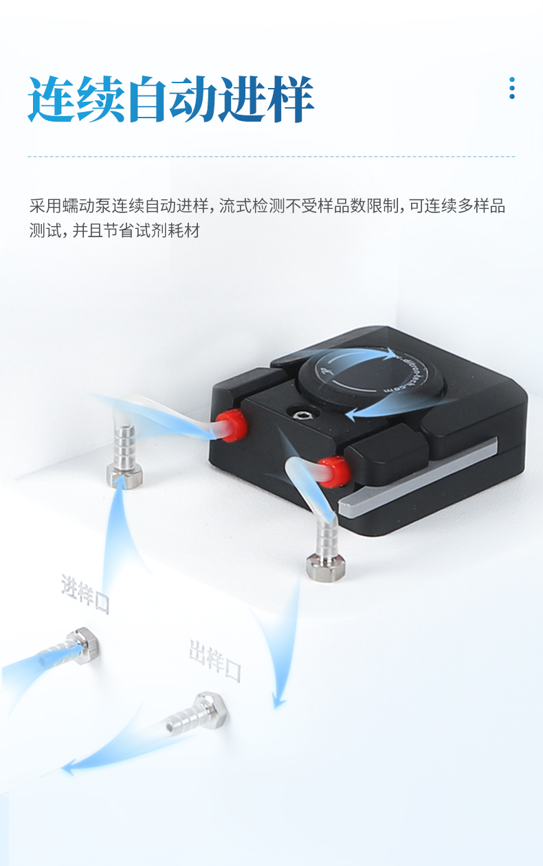 2、采用蠕動泵連續自動進樣,流式檢測不受樣品數限制,可連續多樣品測試,并且節省試劑耗材;