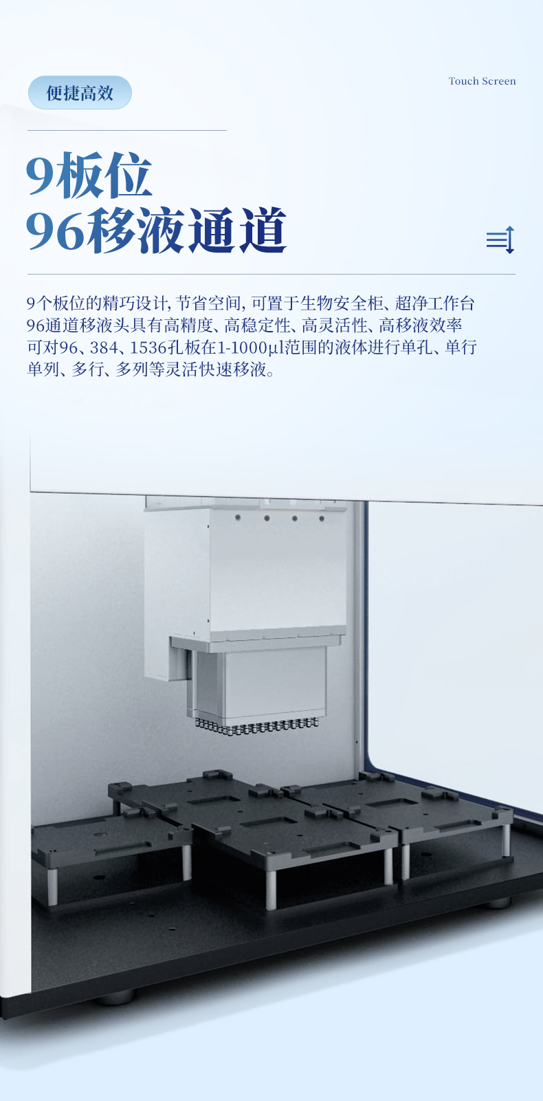 的96通道移液頭具有高精度、高穩定性、高靈活性、高移液效率,可對96、384、1536孔板在1-1000μl范圍的液體進行單孔、單行、單列、多行、多列等靈活快速移液。