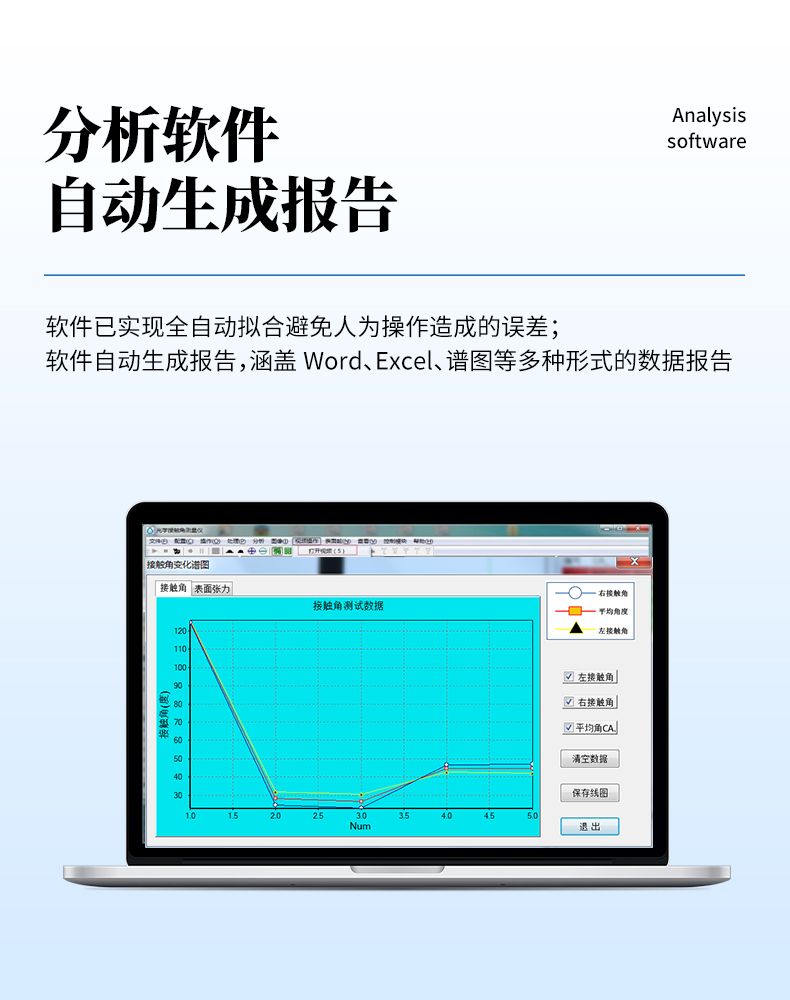 分析軟件功能強大,具備一鍵式全自動擬合能力,具備國際最領先的擬合方法,滿足各種液滴形態的精確擬合;