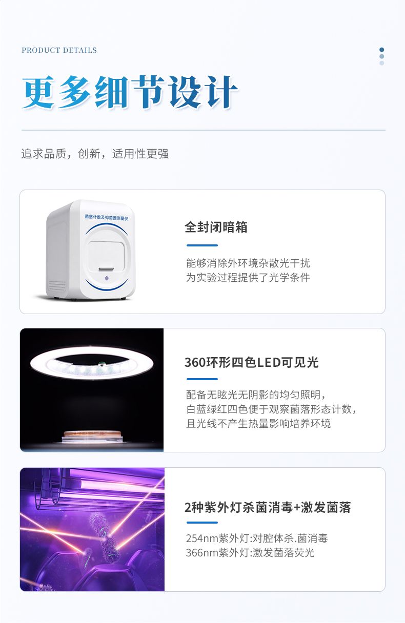 內置366nm紫外燈,可激發菌落熒光,滿足大腸埃希氏菌計數、綠色熒光蛋白觀察等需求