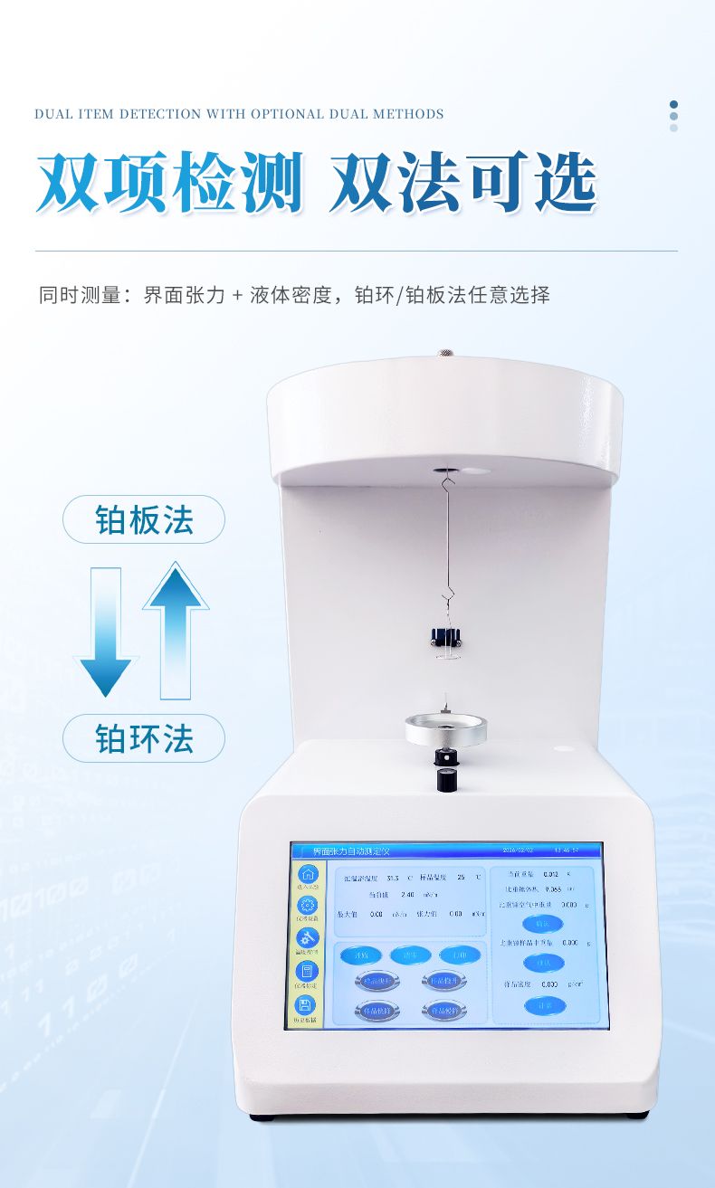 3. 可同時(shí)測(cè)表界面張力和密度:集成兩項(xiàng)測(cè)量功能,無(wú)需額外設(shè)備。