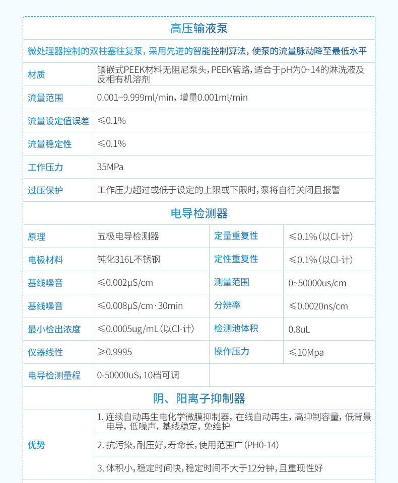 1.1,材質(zhì):鑲嵌式PEEK材料無阻尼泵頭,PEEK管路,適合于pH為0~14的淋洗液及反相有機溶劑。