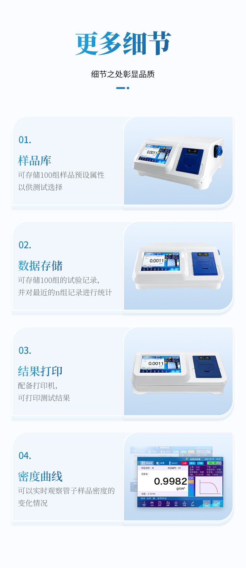 恒溫電子式液體密度計還能配合相應液體的密度濃度轉換軟件,直接讀出濃度值。并且有校準、采樣、恒溫控制、測試、清理、干燥、操作提示、觀察窗、密度曲線、樣品庫、數據儲存、數據統計、結果打印等功能,使用和保養更加方便。