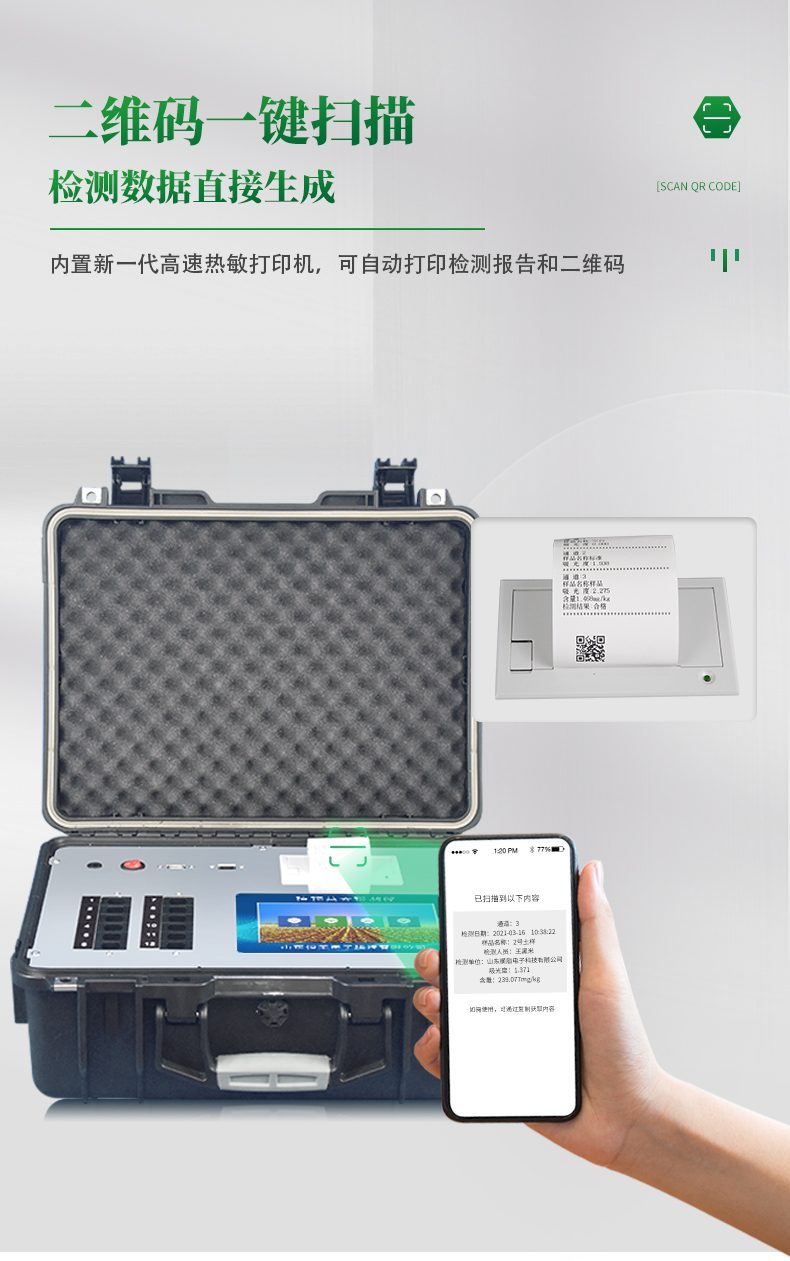8、儀器內置新一代高速熱敏打印機,檢測完成可自動打印檢測報告和二維碼。