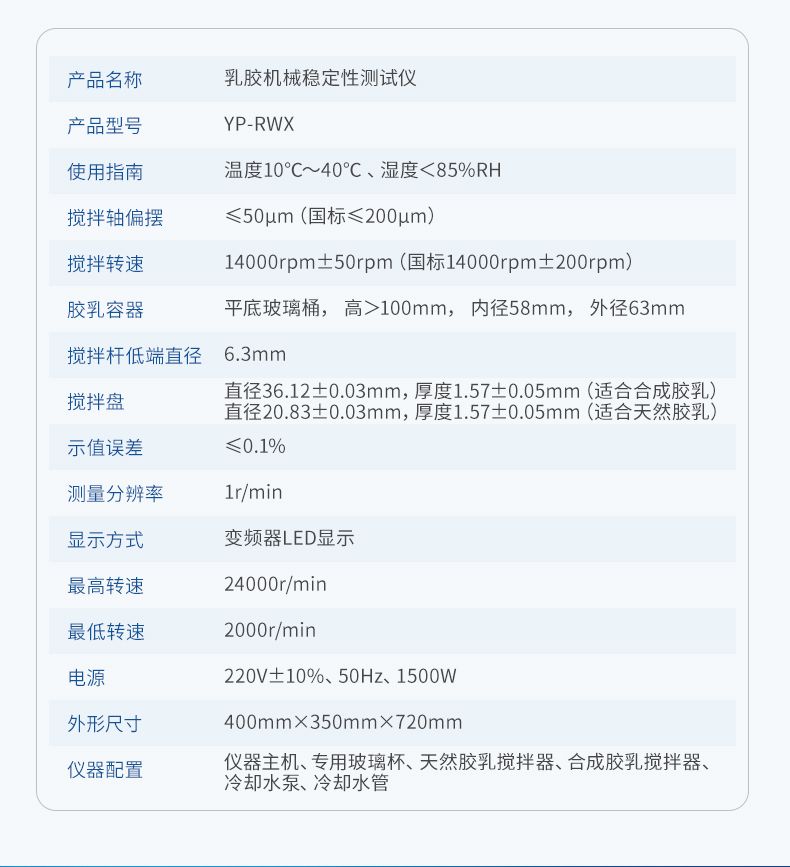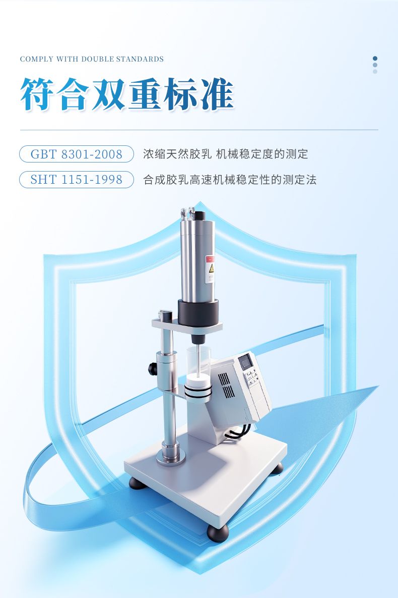 乳膠高速機械穩定性測試儀,符合《GBT 8301-2008 濃縮天然膠乳 機械穩定度的測定》和《SHT 1151-1998 合成膠乳高速機械穩定性的測定法》標準要求。該儀器主要適用于膠乳生產單位和科研院所對天然膠乳和合成膠乳做機械穩定性測試,是提高膠乳質量必不可少的儀器。