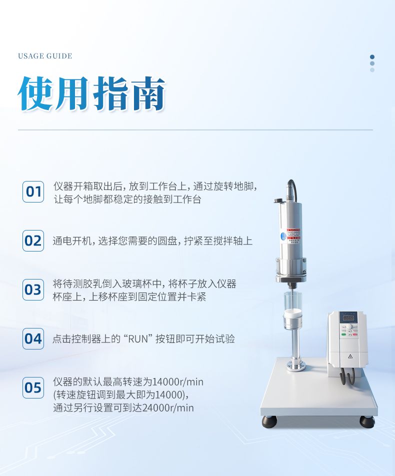 儀器開箱取出后,放到工作臺上,通過旋轉地腳,讓每個地腳都穩定的接觸到工作臺,通電開機,選擇您需要的圓盤,擰緊至攪拌軸上,將待測膠乳倒入玻璃杯中,將杯子放入儀器杯座上,上移杯座到固定位置并卡緊,點擊控制器上面的“RUN”按鈕即可開始試驗。儀器的默認最高轉速為14000r/min(轉速旋鈕調到最大即為14000),通過另行設置可到達24000r/min。