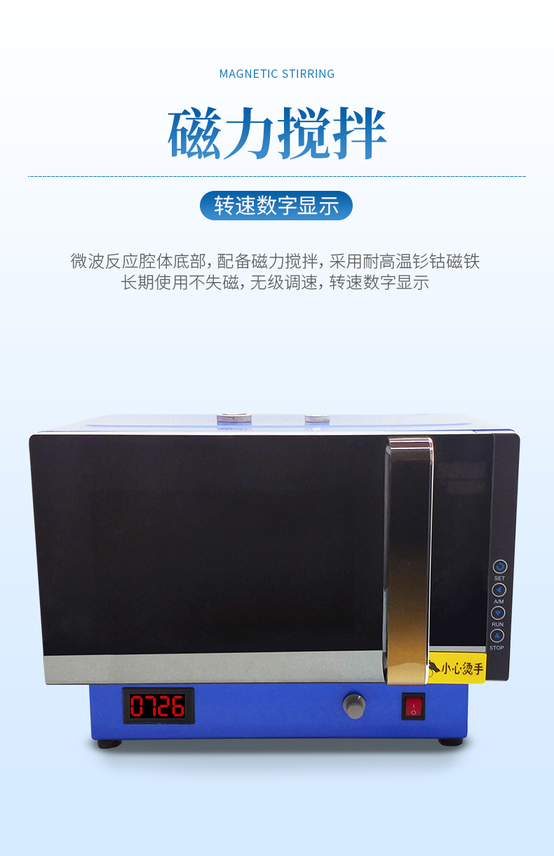 微波反應腔體底部,配備磁力攪拌,采用耐高溫釤鈷磁鐵,最大工作溫度可達350℃,長期使用不失磁,無級調速,轉速數字顯示。