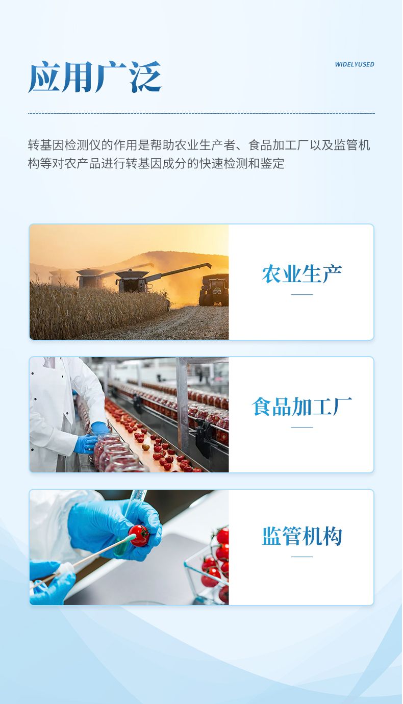 轉(zhuǎn)基因檢測(cè)儀的使用可以幫助農(nóng)產(chǎn)品生產(chǎn)者和相關(guān)部門確保農(nóng)產(chǎn)品的品質(zhì)和安全性,并確保符合相關(guān)法規(guī)和標(biāo)準(zhǔn)。這對(duì)于消費(fèi)者的食品選擇和信息透明也非常重要。