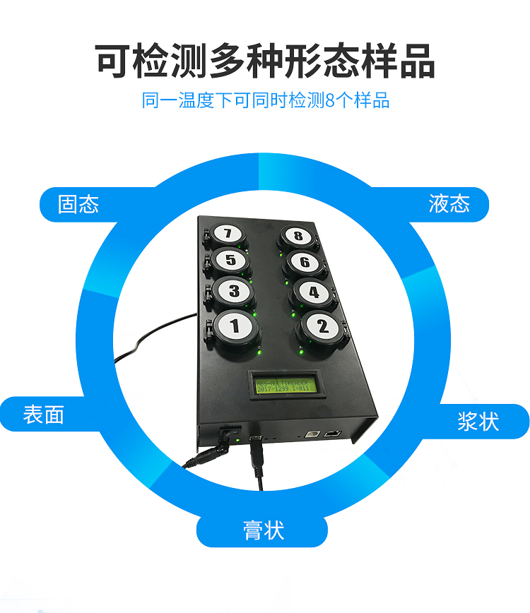4) 檢測樣本只需1ml/1g;同一溫度下可同時檢測8個樣品;