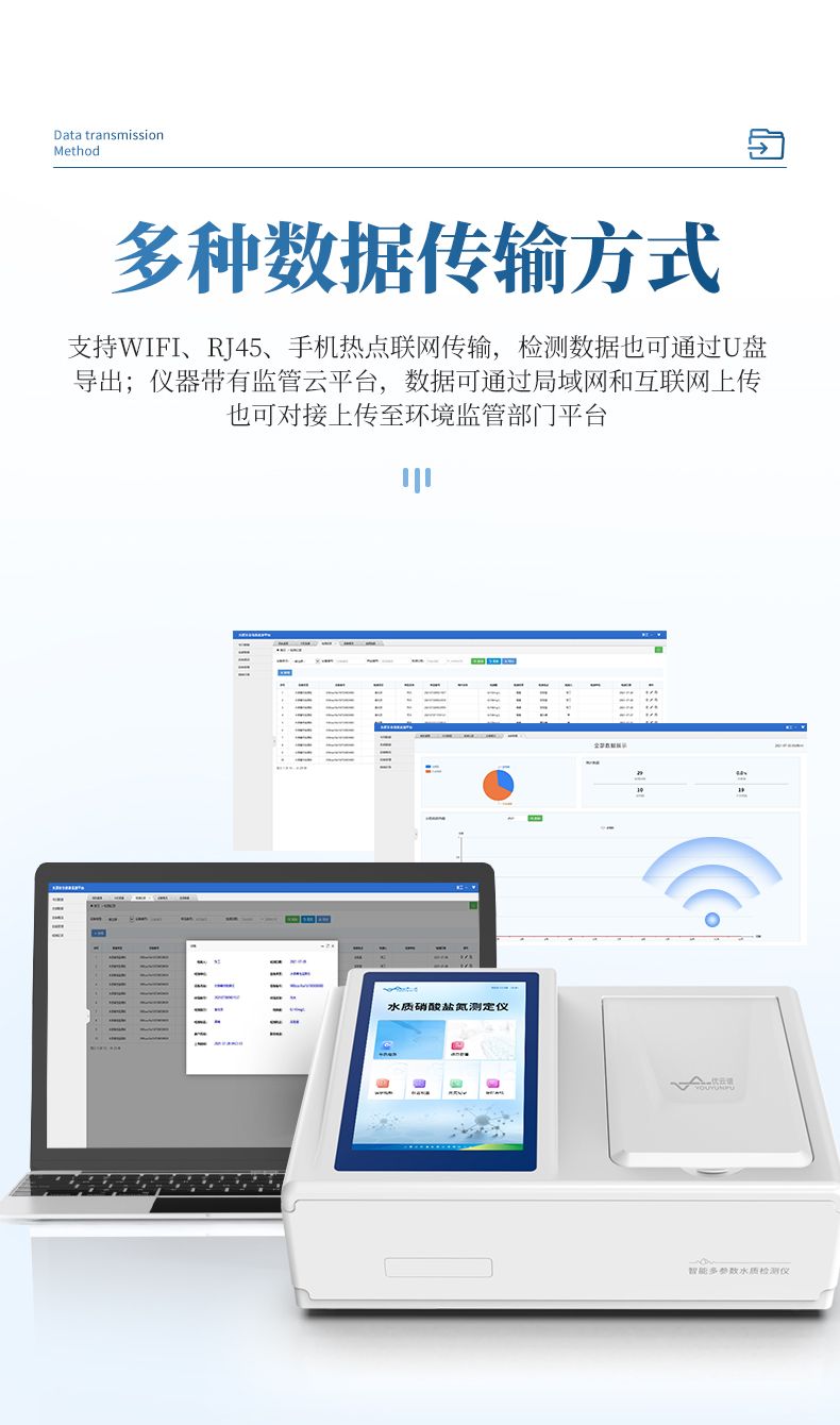 6、具有無線通訊功能,支持WIFI、RJ45、手機熱點聯網傳輸,檢測數據亦可通過U盤導出;